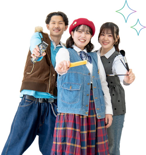 山美では毎月オープンキャンパスを開催中。カット、ワインディング、メイク、ネイル、ヘアアレンジ……好きなメニューを何度でも体験できます。先輩たちもみんな、ここからスタートしました。